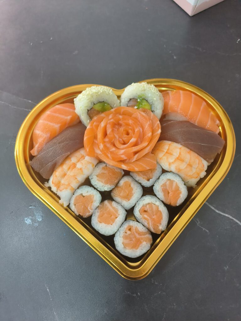 2nigiri de salmon2nigiri de atún 1 salmón de flor 6 uramaki corazon