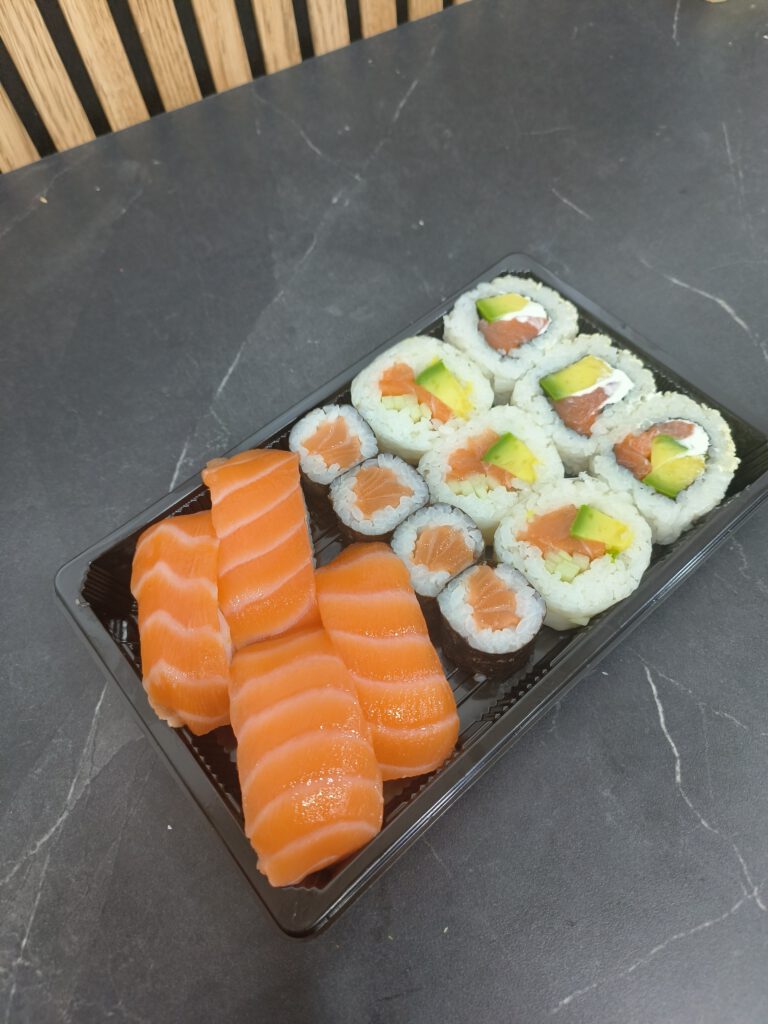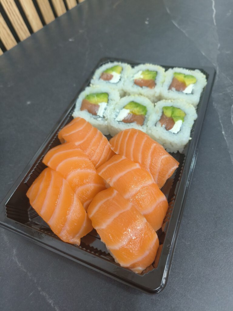 4 Nigiri salmón, 4 Maki salmón, 3 Slim maki salmón, 3 Uramaki salmón, aguacate y sésamo