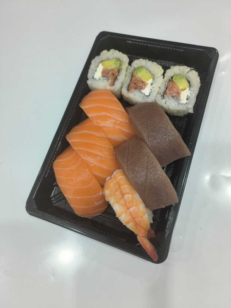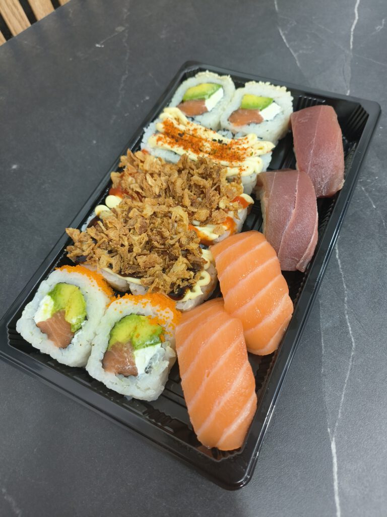 1 Nigiri langostino, 1 Nigiri atún, 2 Nigiri salmón, 2 Surimi tobiko roll, 2 Salmon crispy roll, 2Uramaki salmón y aguacate