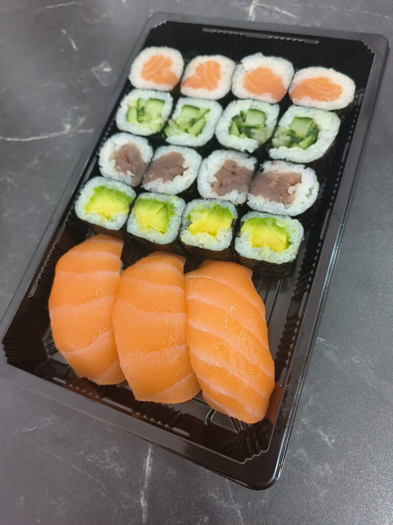 4 Maki salmón, 4 Maki atún, 4 Maki pepino, 4 Maki aguacate,3 Nigiri salmón