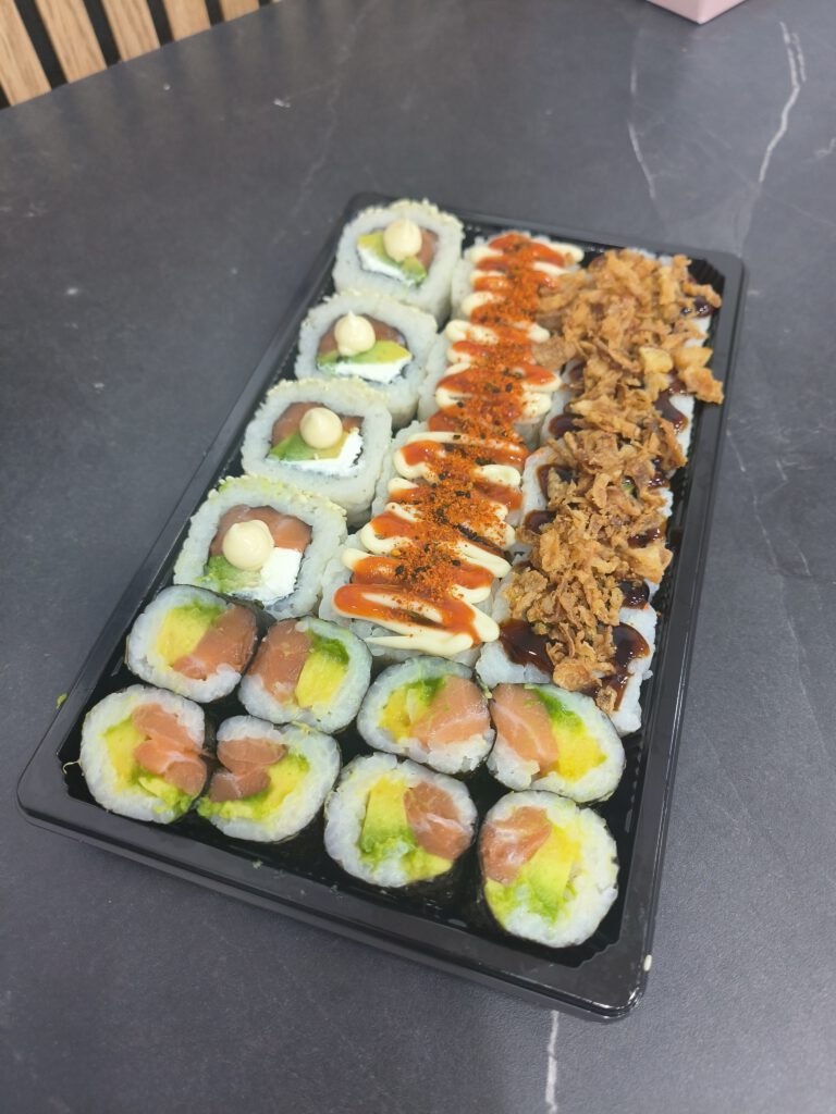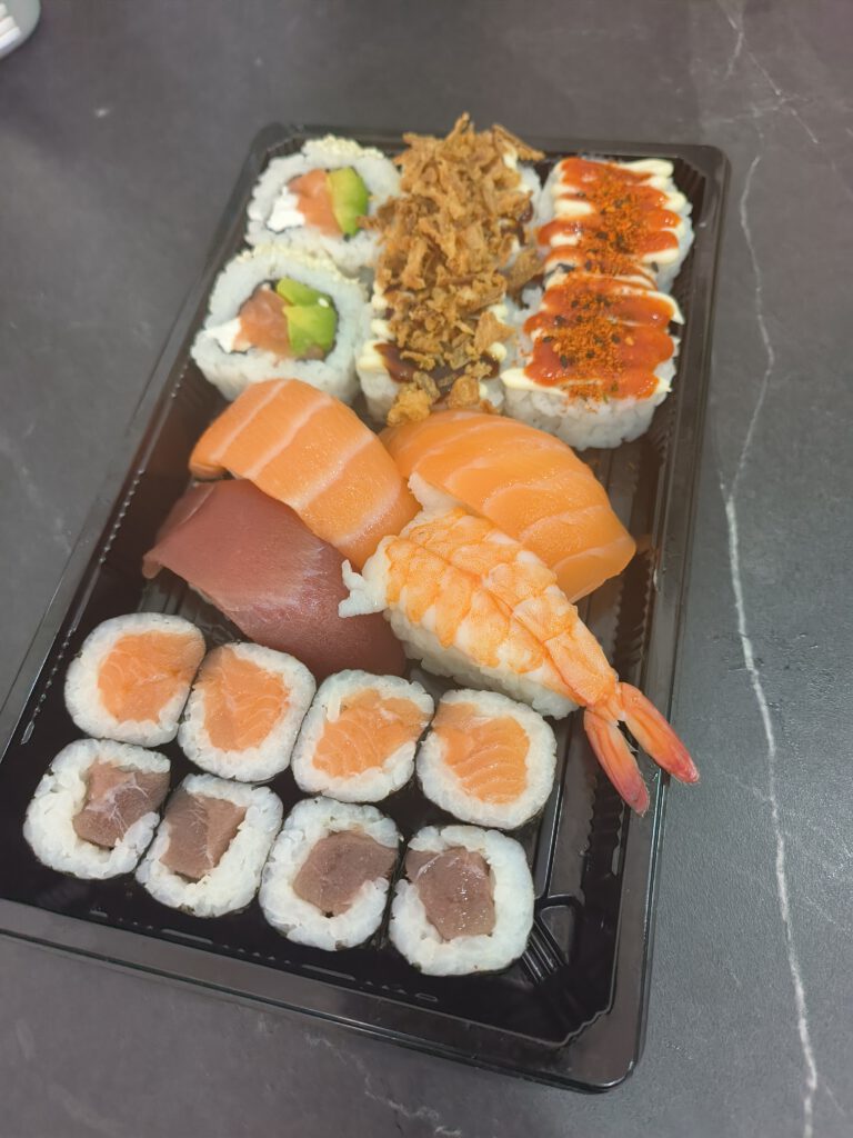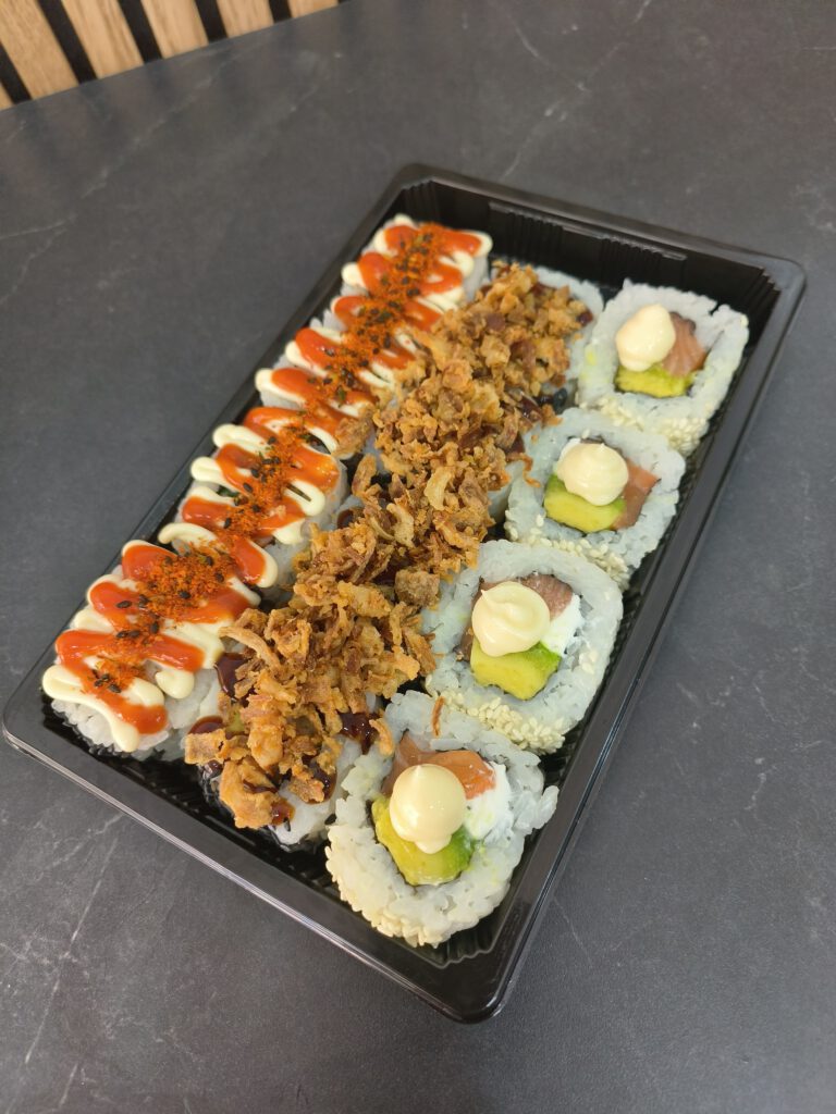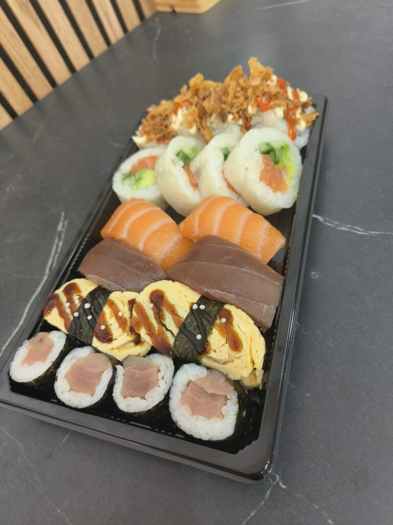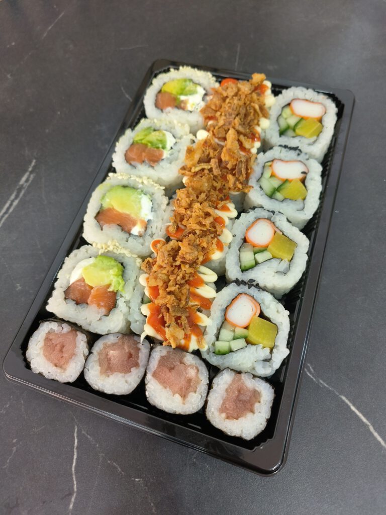 4 Maki de atún, 4 Uramaki california, 4 Uramaki salmón y queso crema, 4 Crispy roll surimi aguacate pepino cebolla crujiente y sésamo