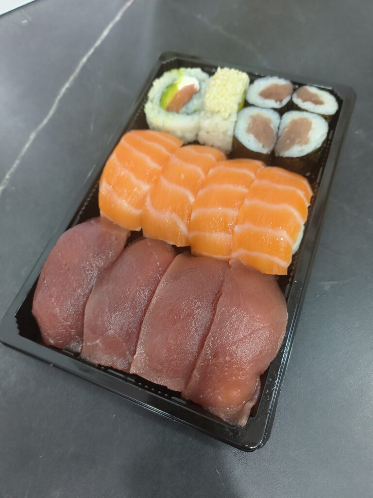 2 Nigiri salmón, 1 Nigiri atún, 1 Nigiri langostino, 4 Maki salmón,4 Maki atún, 4 Uramaki california, 2 Spicy California